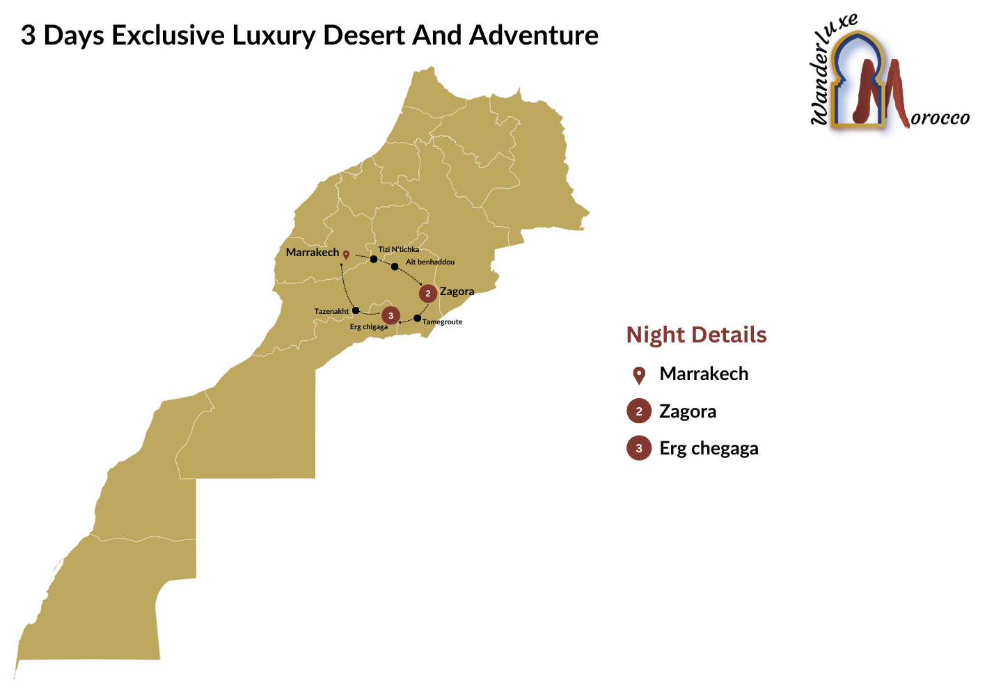 Experience the Enchanting Sands of Morocco: A 3-Day Luxury Escape to the Erg Chigaga Dunes Indulge in a captivating journey through the heart of Morocco, where ancient history meets breathtaking landscapes. This exclusive 3-day adventure departs from the vibrant city of Marrakech, leading you on a luxurious exploration of the Sahara Desert’s majestic dunes.