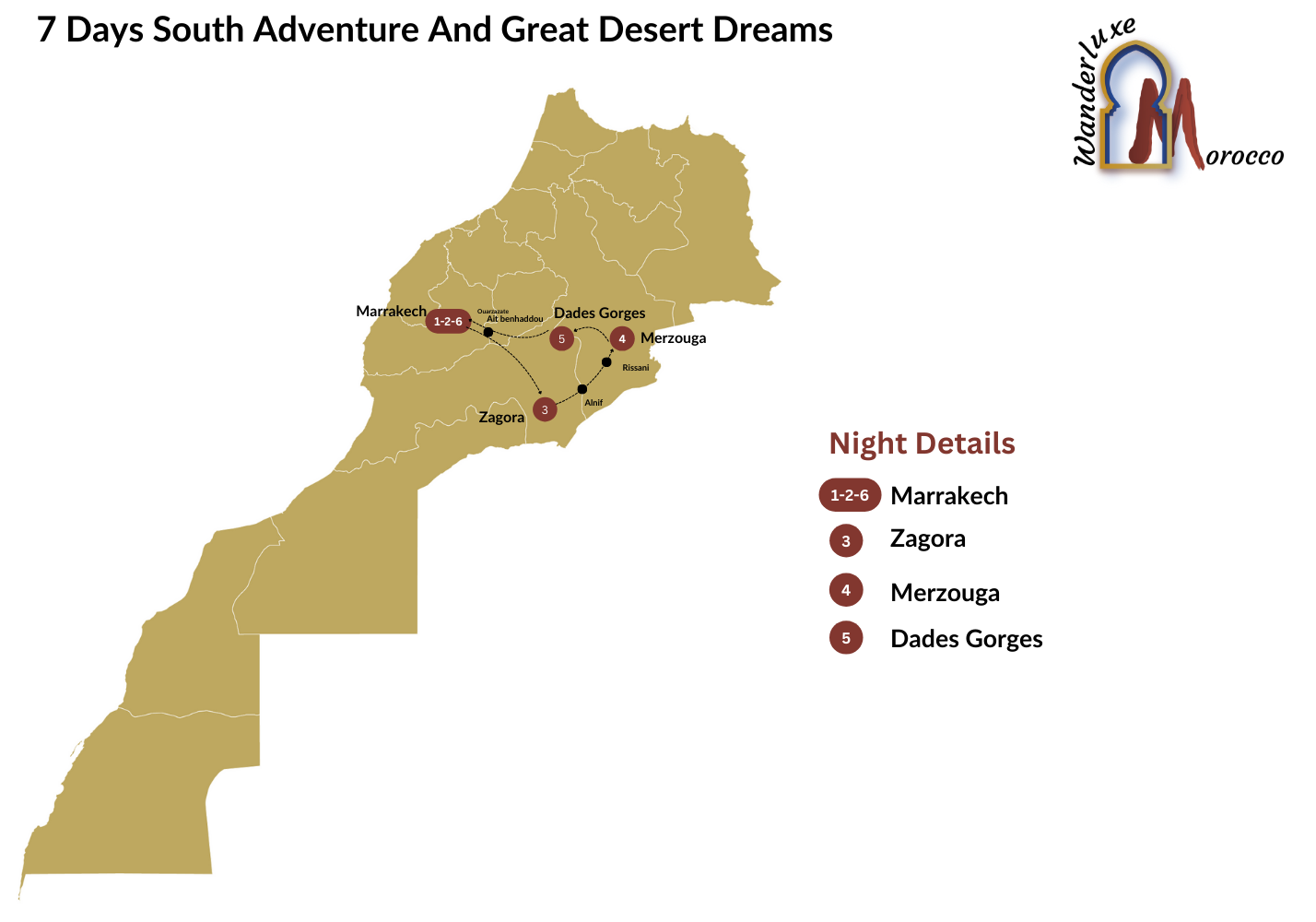 Embark on an exhilarating 7-day journey through Morocco’s most captivating landscapes with our Desert Adventure tour. Begin your exploration in Marrakech, where bustling souks and historic palaces await. Traverse the Atlas Mountains to Zagora, known as the gateway to the desert, and marvel at the ancient kasbahs of Ait Benhaddou along the way. Experience the magic of Merzouga’s Erg Chebbi dunes with a camel ride at sunset and an unforgettable night in a desert camp under the stars. Explore the dramatic Todra Gorges and Dades Valley, where breathtaking vistas and Berber hospitality abound. Conclude your adventure with a return to Marrakech, enriched by the sights, sounds, and flavors of Morocco. Join us for an immersive journey that promises lifelong memories and a deep connection to Morocco’s diverse culture and natural beauty.