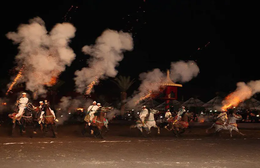Experience an enchanting evening at the Dinner Show Fantasia Chez Ali in Marrakech, where Moroccan traditions, music, and dance converge. Since 1980, Chez Ali Restaurant has been synonymous with cultural immersion and entertainment, offering a captivating journey through Morocco’s rich heritage. Step into the opulent world of Chez Ali with a warm Moroccan welcome, setting the stage for an immersive experience. The highlight of the night is the mesmerizing Fantasia Show, featuring traditional songs, dazzling dances, and thrilling equestrian acrobatics. Indulge in a sumptuous Moroccan dinner in elegant Bedouin tents, savoring aromatic tagines, flavorful couscous, and delicate pastries. The evening culminates in a grand display of traditional firing, symbolizing ancient battles and victories. With belly dancers, acrobats, and more adding to the spectacle, Dinner Show Fantasia Chez Ali promises an unforgettable blend of entertainment and cultural celebration.