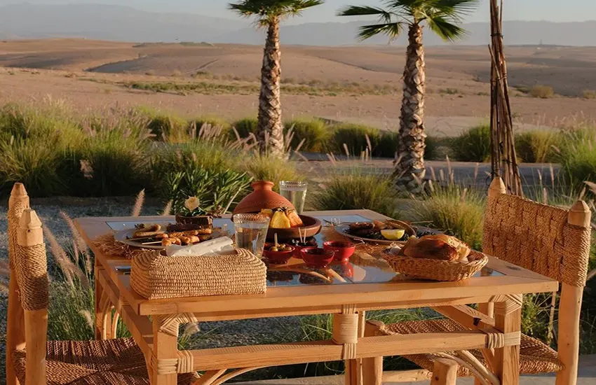 Opulent Sunset Spectacle: Witness the desert transform into a masterpiece of vibrant hues as the sun gracefully sets, casting a mesmerizing glow over the breathtaking Agafay landscape. Gourmet Gastronomy: Delight your senses with an exquisite feast of authentic Moroccan cuisine, masterfully curated to offer a symphony of flavors and aromatic spices, tantalizing your palate with every bite. Cultural Masterpiece: Be captivated by a live traditional performance under the starlit sky, featuring talented musicians and skilled entertainers who elegantly bring the rich tapestry of Moroccan culture to life.
